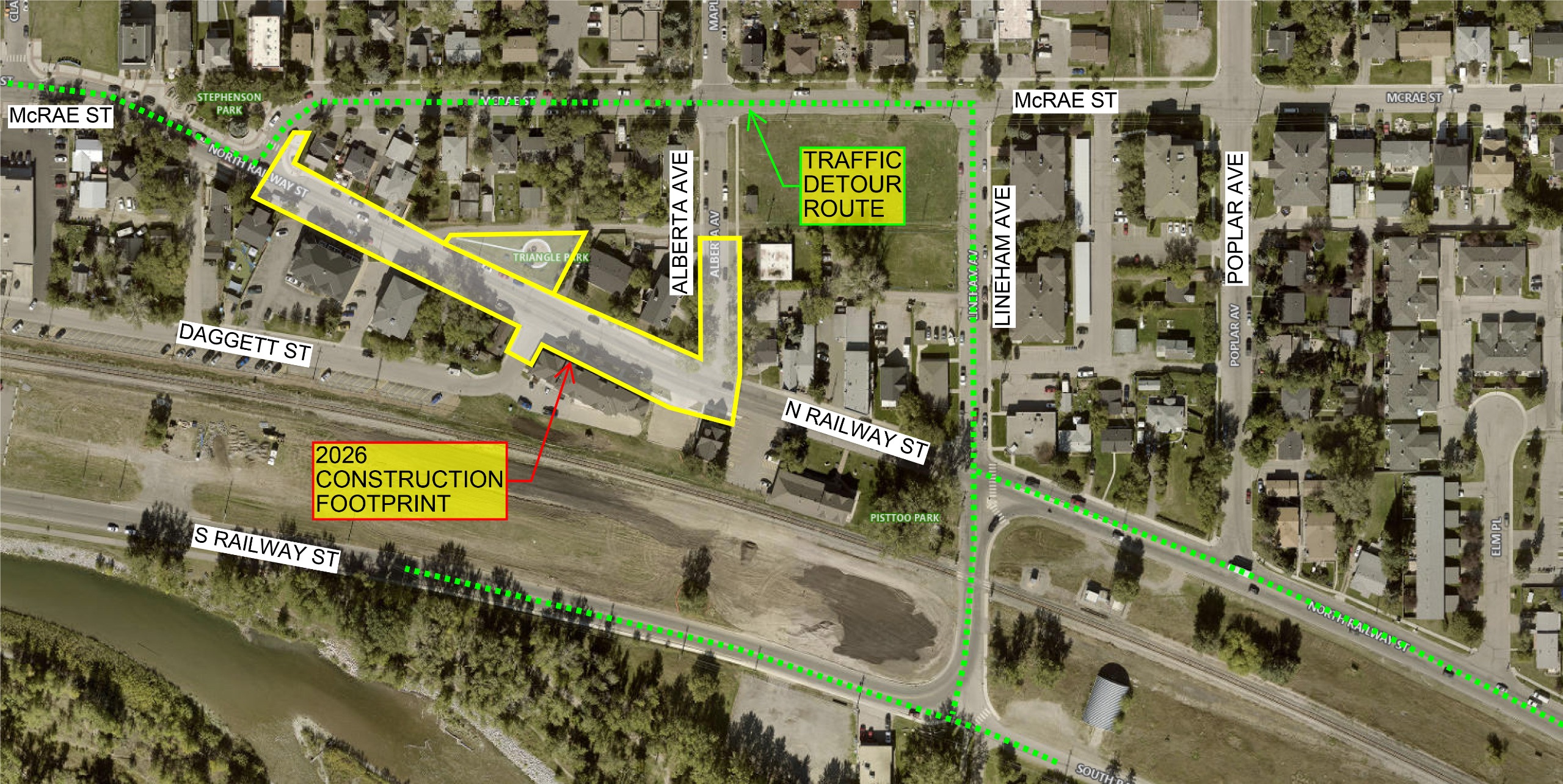 Phase 2 of the Downtown Improvement Project will begin in the spring of 2026 along North Railway Street between Alberta Avenue and McRae Street, plus work on Alberta Avenue itself. Work will include:
